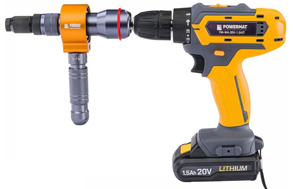 Rebitador profissional POWERMAT 3 em 1, graças ao qual você pode realizar fixações com rebites e porcas de rebite de uma forma incrivelmente fácil e rápida. Uma pequena estrutura ergonômica com um mecanismo interno de rolamento de esferas reforçado e uma alça em T permitem o uso de altas forças necessárias para trabalhar com os maiores e mais duros rebites e porcas de rebites cegos.